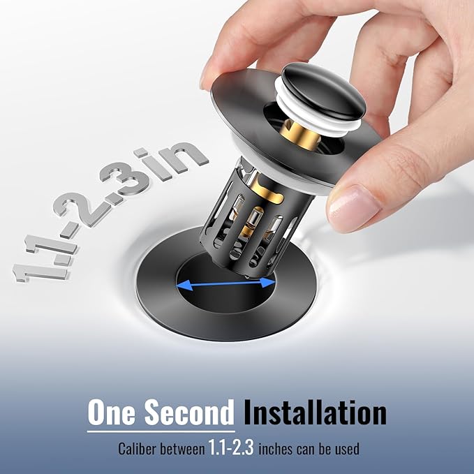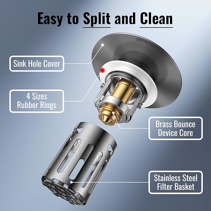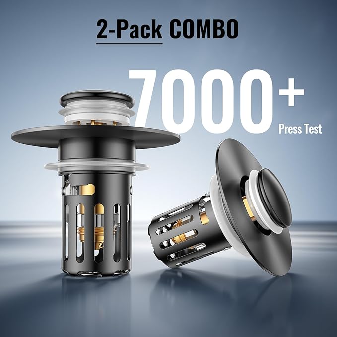 - [π‘οΈ All-Metal & Unbreakable Durability] Built to last a lifetime, the entire sink drain strainer mechanism is crafted from premium stainless steel and a corrosion-resistant solid brass core. Unlike flimsy plastic alternatives, our drain stopper withstands extreme daily use, and the hardened bronze spring switch is tested over 7000+ cycles without failure. The robust construction guarantees a reliable 3-5 year lifespan, far outlasting ordinary drain strainer and rubber components.